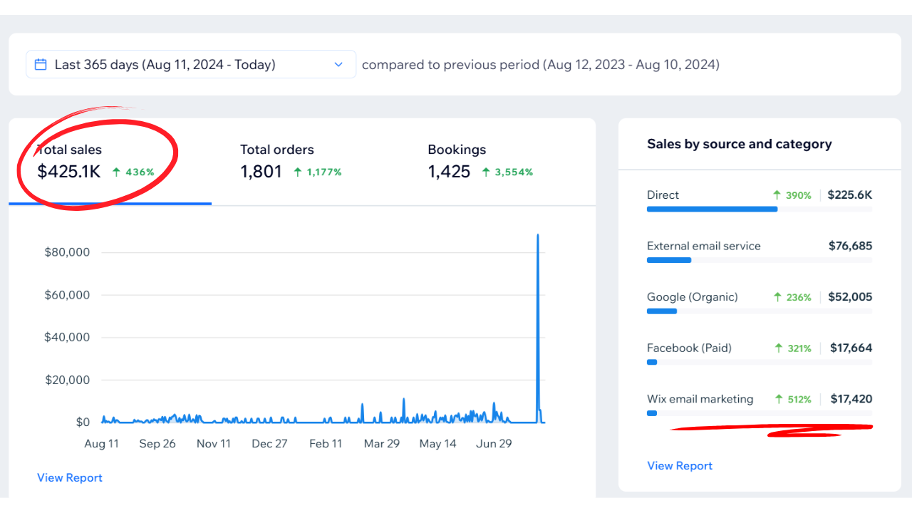$425K total sales with 436% growth. 1,801 orders, 1,425 bookings.
