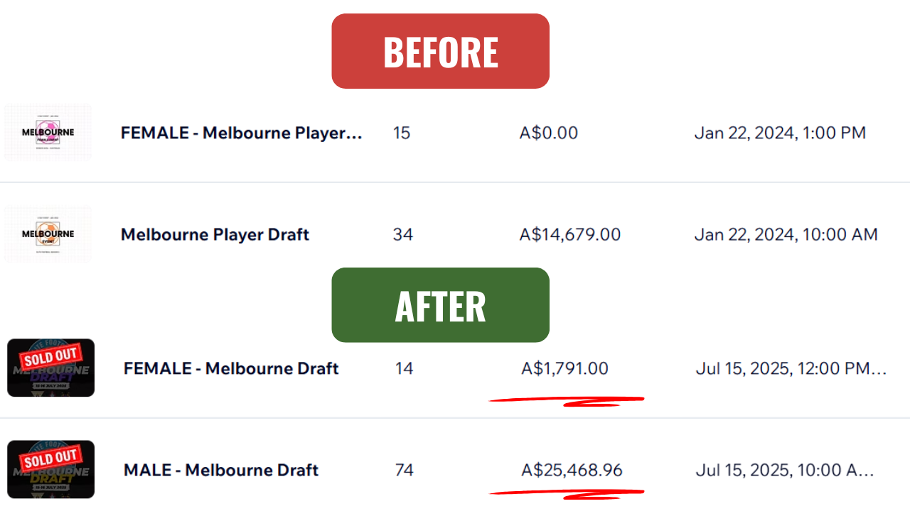 From 49 tickets to 88 and $25K+ in packed Melbourne Draft events. Real transformation.